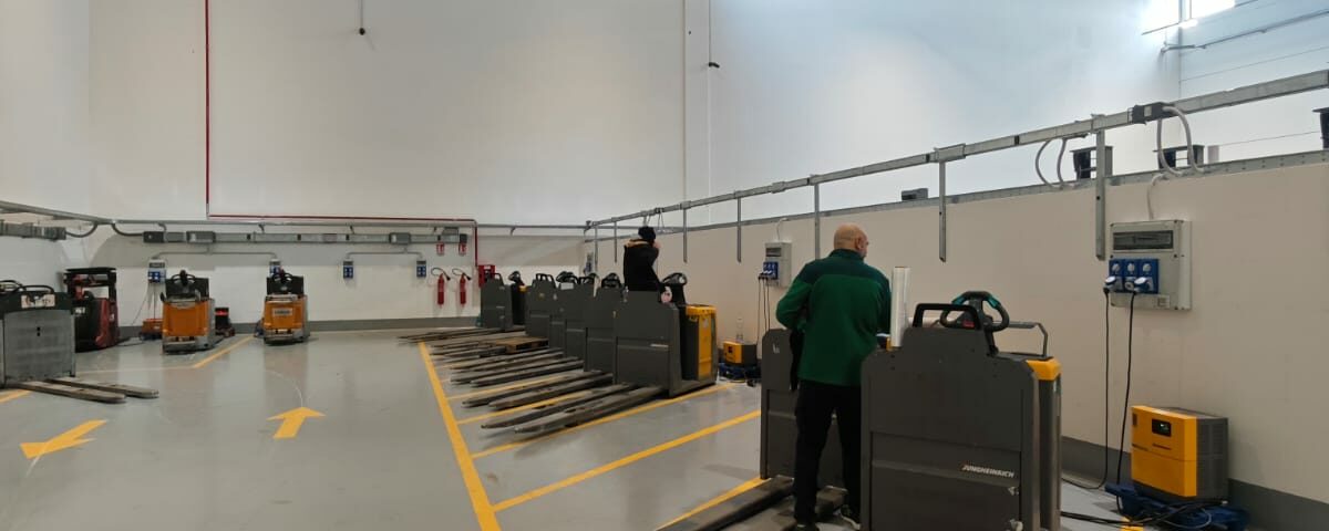 Pavimentazione in resina ad alte prestazioni per l’area di ricarica carrelli elevatori e transpallet elettrici.