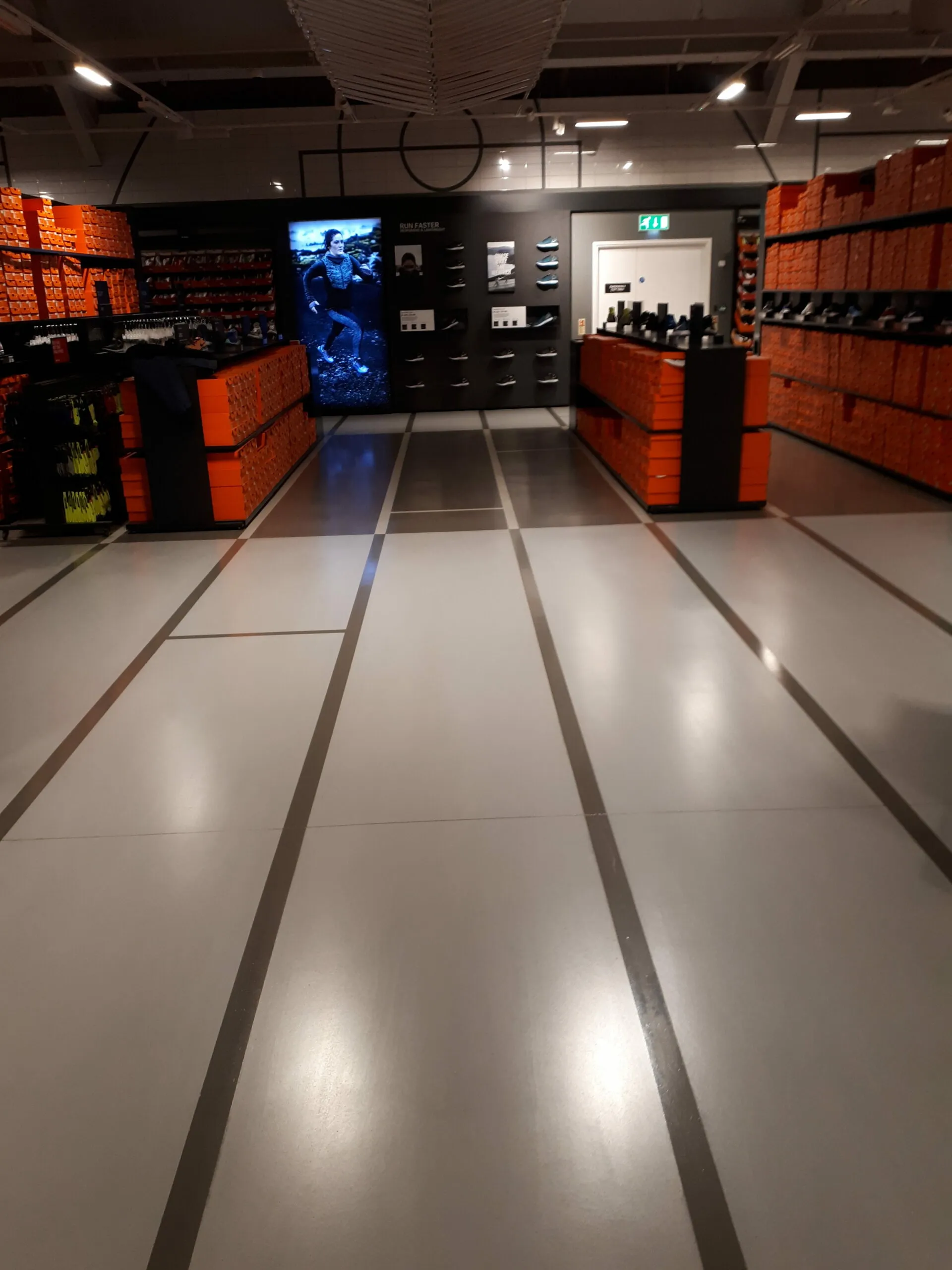 Nel Factory Store di Braintree nella versione Mid Grey.Ultratop Mid Grey e un altro punto vendita di Nike vestito con i pavimenti customizzati in resina Prima!