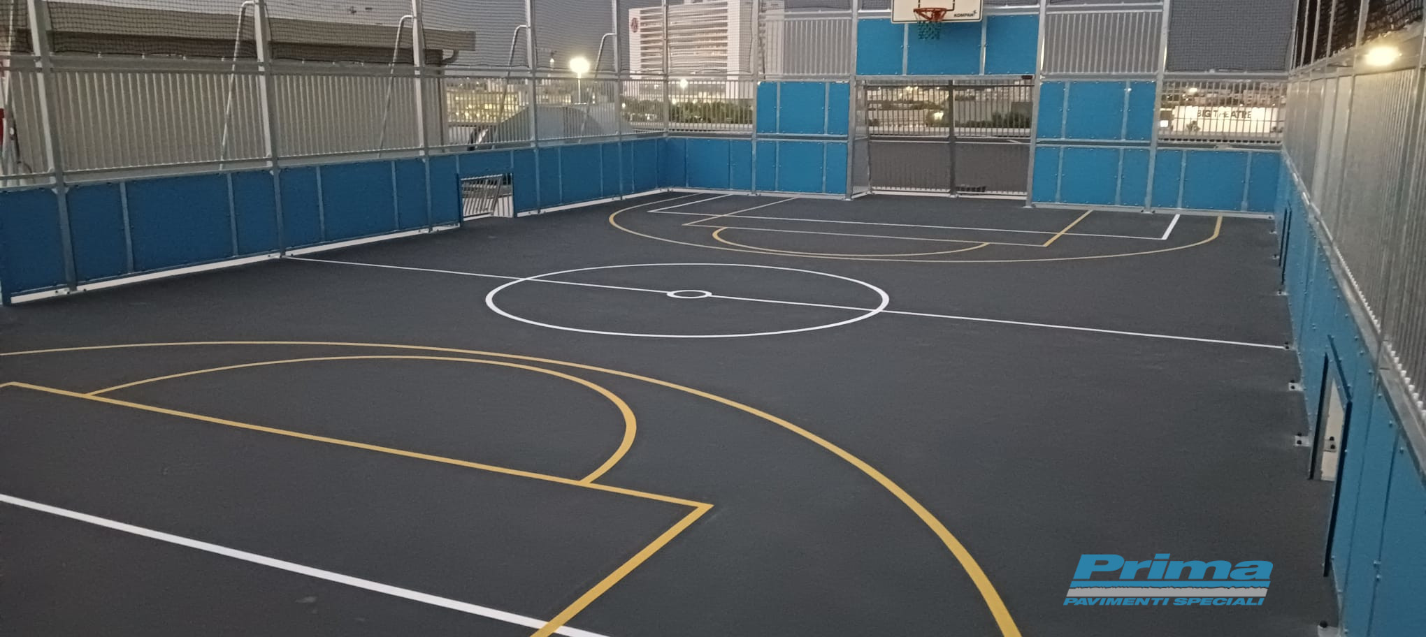 Prima Pavimenti si è occupata dell’intero sistema di pavimentazione, integrando soluzioni industriali per l’area retail e tecnologie sportive certificate per il campo polisportivo.