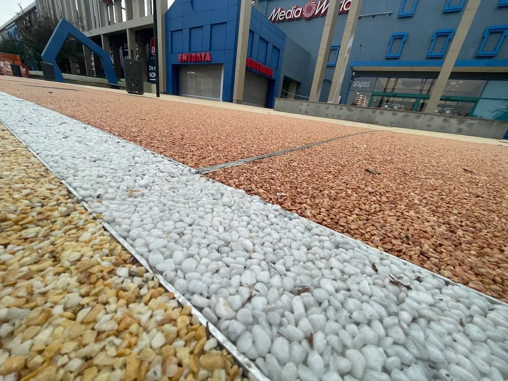 La soluzione scelta è stata la nostra pavimentazione drenante Prima Drain Stone® , con inerti di diversi colori, specifiche da capitolato. Parte delle lavorazioni si sono svolte in orario notturno per non arrecare disturbo all’attività del centro commerciale.