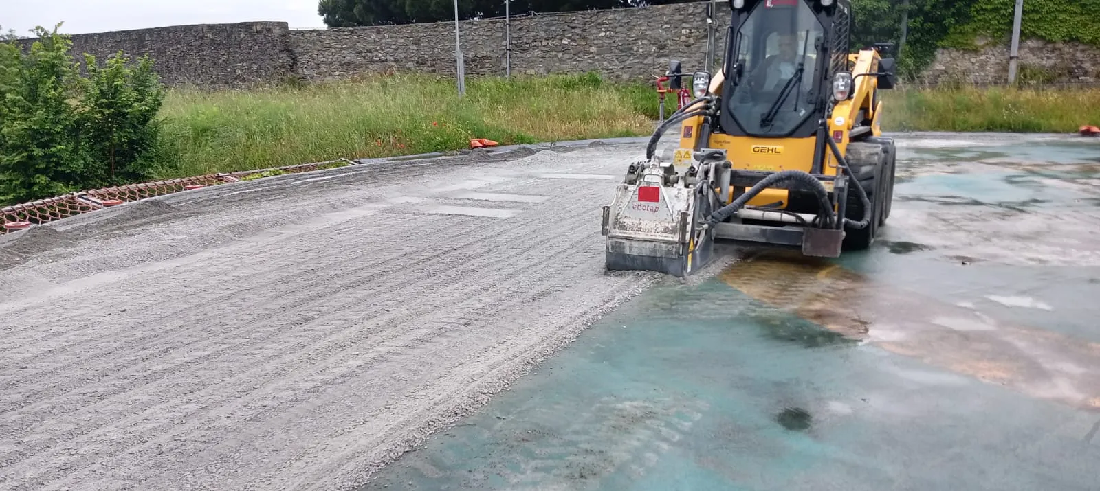 Durante i lavori, come evidenziato nell’immagine a destra, abbiamo effettuato la scarifica del sottofondo, rimuovendo circa 10 mm di rivestimento degradato per garantire una base in calcestruzzo uniforme, pulita e leggermente ruvida. Dopo la completa asportazione di macerie e polveri, l’area è stata preparata per l’applicazione del nuovo strato di resina, assicurando così una perfetta adesione e durabilità della pavimentazione.