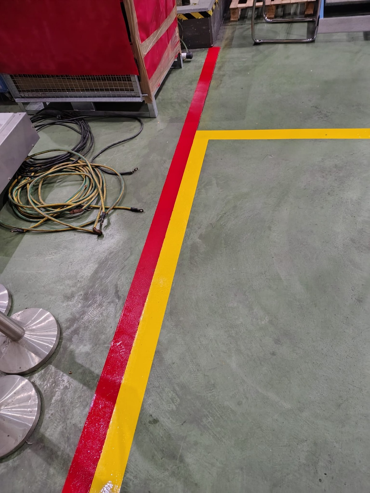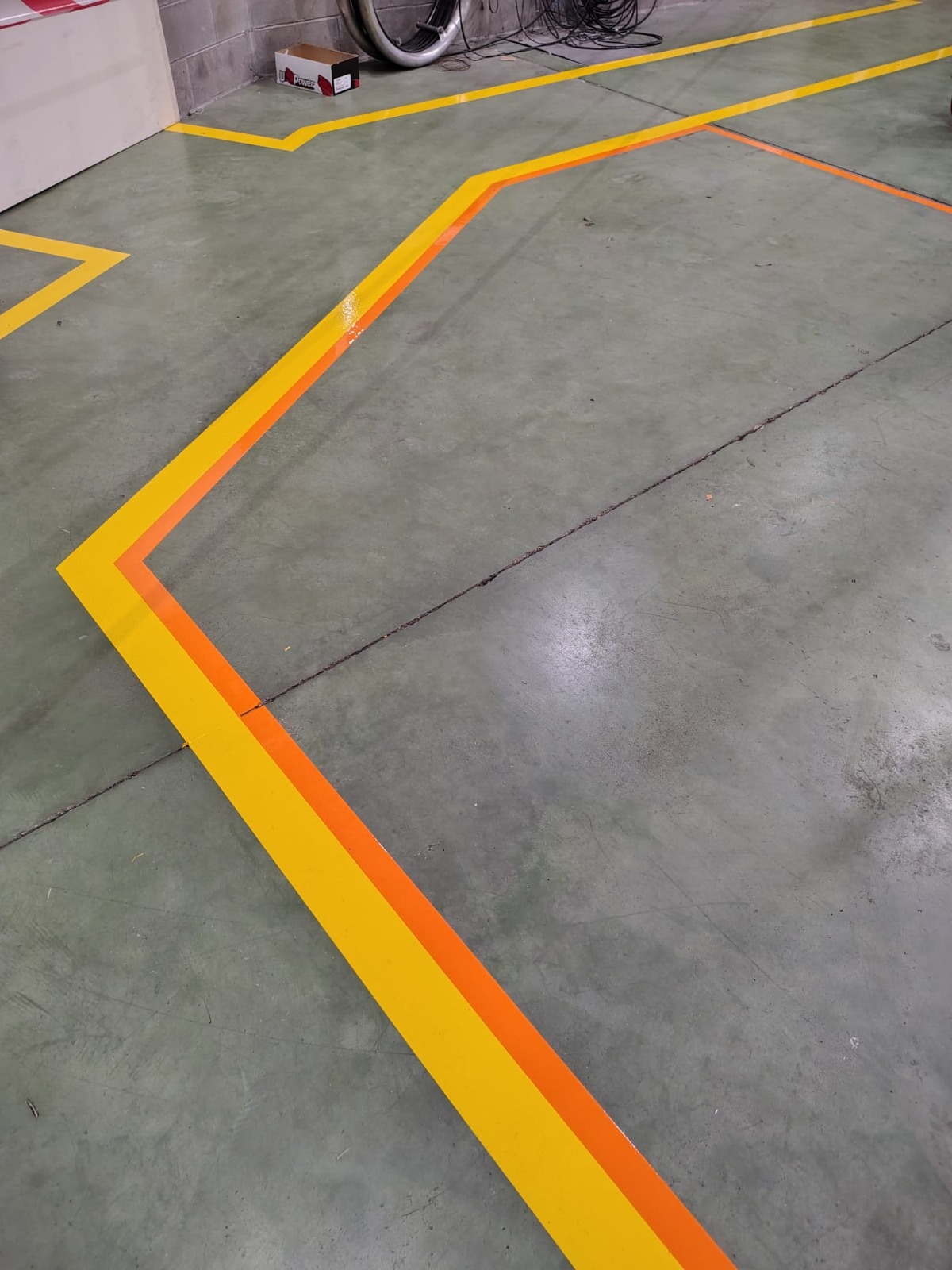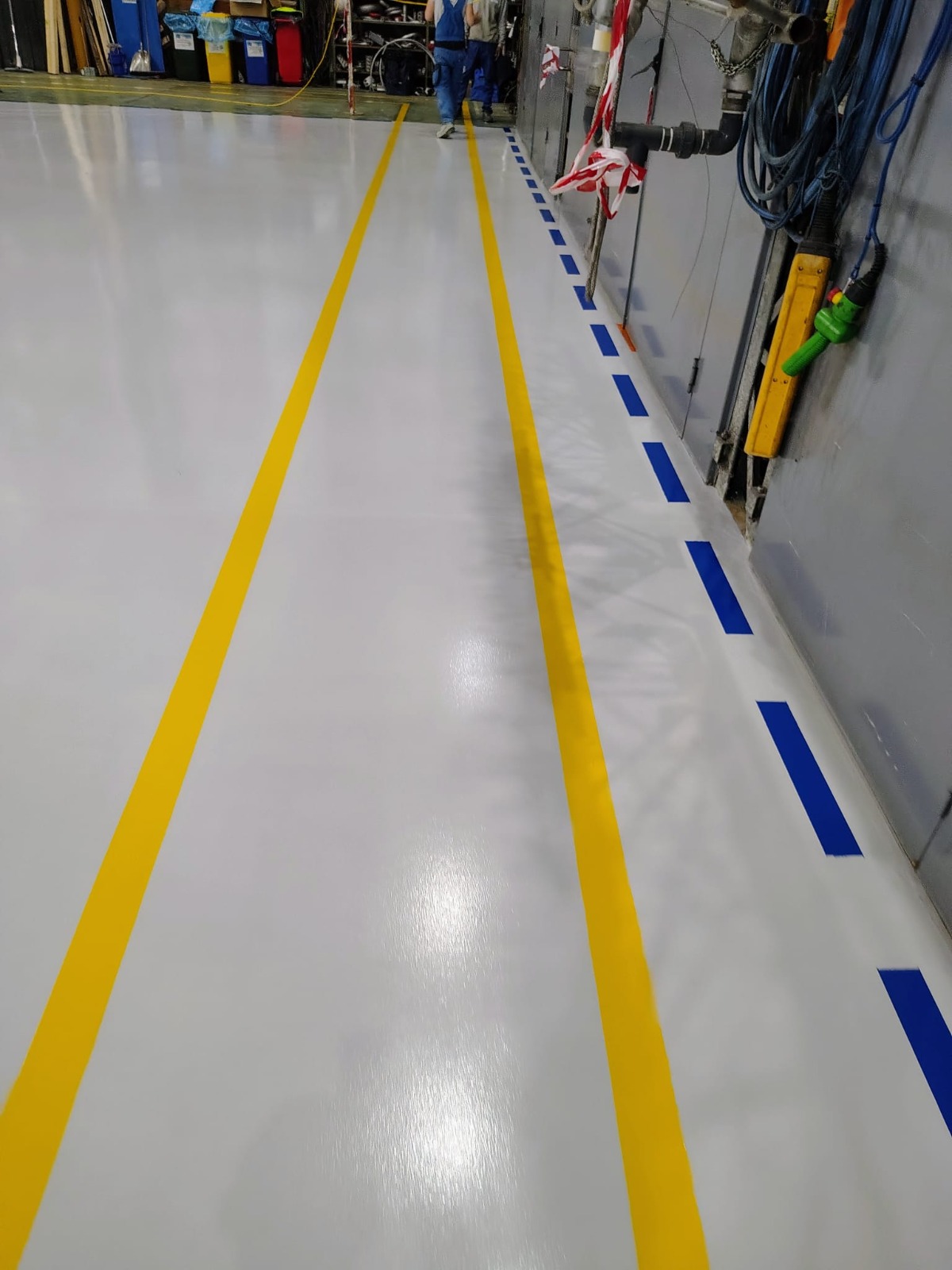 Parallelamente alla verniciatura, Prima ha realizzato la segnaletica orizzontale interna con strisce in resina di larghezza compresa tra 10 e 12 centimetri. Si tratta di una soluzione tecnica che offre vantaggi significativi rispetto alla tradizionale segnaletica in vernice: le strisce in resina presentano maggiore spessore, migliore resistenza all’usura da transito e una resa cromatica più stabile nel tempo, garantendo la leggibilità della segnaletica anche dopo mesi di utilizzo intensivo.
