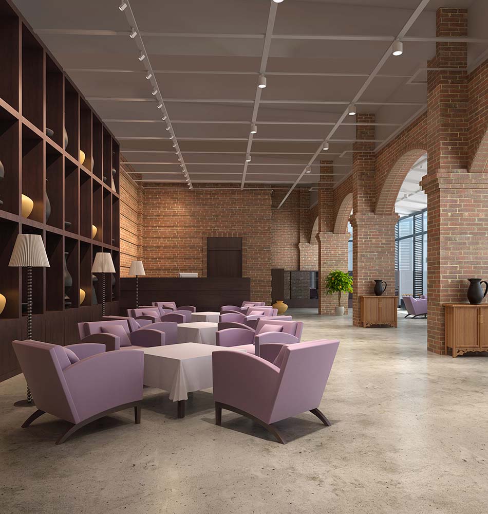 Questo è il locale più importante di un albergo, quello da cui si diramano tutti gli altri ambienti. Un biglietto da visita che deve essere curato nei dettagli poiché ha il compito di ricevere gli ospiti. Da qui si snodano tutti i componenti dell’albergo. Deve esserci sempre una zona di front office con un bancone e una riservata di back office per il personale. Il pavimento rispecchia lo spirito e l’identità dell’intera struttura e, combinando colori e design, può mettere in evidenza l’identità del brand. Trattandosi di aree ad alto traffico, le soluzioni per le pavimentazioni devono, garantire un’elevata resistenza, facilità di pulizia e manutenzione.
