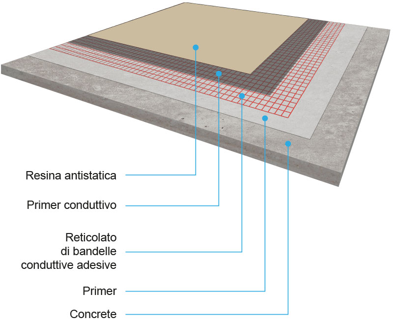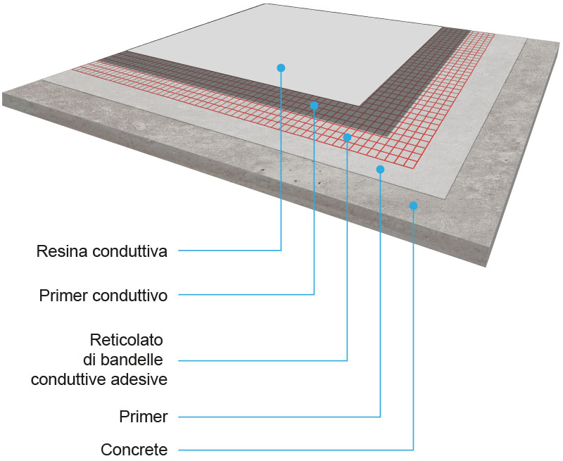 Questo trattamento viene impiegato come rivestimento elettricamente conduttivo per supporti in calcestruzzo e massetti cementizi anche sottoposti a traffico medio-pesante. È particolarmente indicato in diversi settori dell’attività industriale, in particolare nell’industria elettronica, farmaceutica, automobilistica, nei magazzini di deposito di prodotti infiammabili e di polveri combustibili, nel settore aeronautico e spaziale. In particolare viene impiegato per la realizzazione di rivestimenti conduttivi in ambienti dedicati alle lavorazioni di componenti ed apparati elettronici ad elevata tecnologia, di attrezzature mediche, nelle sale computer, nelle aree di ricarica delle batterie e in tutti i locali ove richiesto un rivestimento elettroconduttivo.