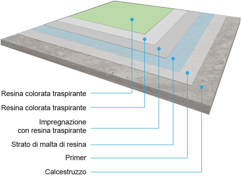 5. Rasatura con resina epossidica traspirante tinta Ral spolverata a rifiuto con quarzo sferoidale.