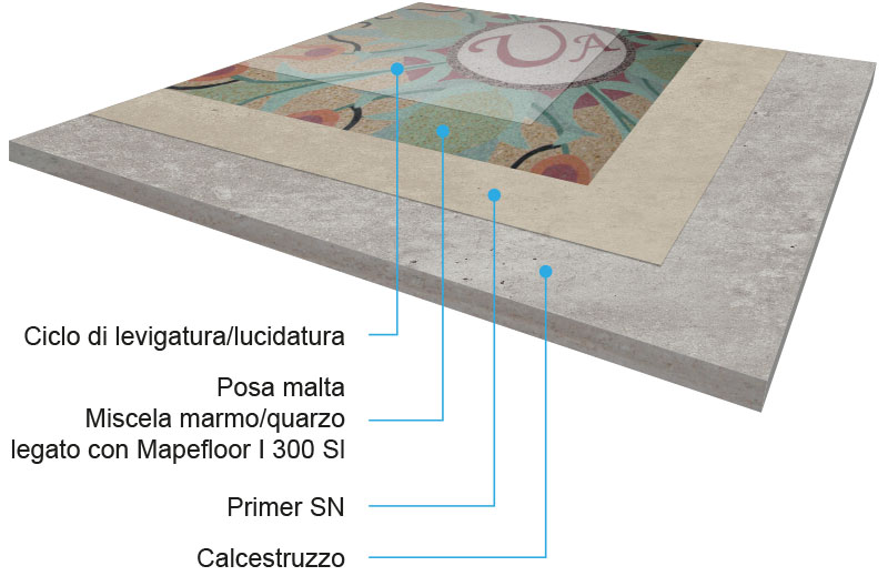 MAPEFLOOR SYSTEM 35 è un sistema per la realizzazione di pavimentazioni levigate tipo “Terrazzo alla veneziana” mediante stesura, in uno spessore di circa 10 mm, di miscela composta da un legante epossidico bicomponente e da una speciale miscela di aggregati di diversi colori, dimensioni e natura.
