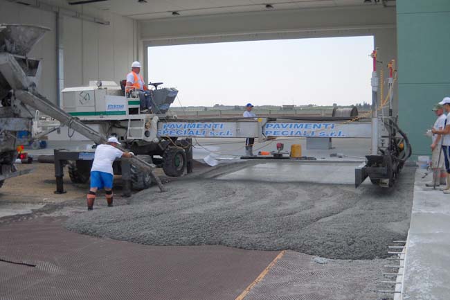 Con questo sistema il calcestruzzo viene vibro-steso, eliminando così l’aria al suo interno. La superficie risulta essere più compatta e resistente, oltre a diminuire sensibilmente i tempi di realizzazione e posa.